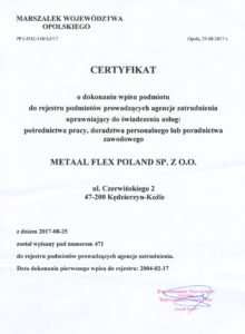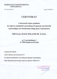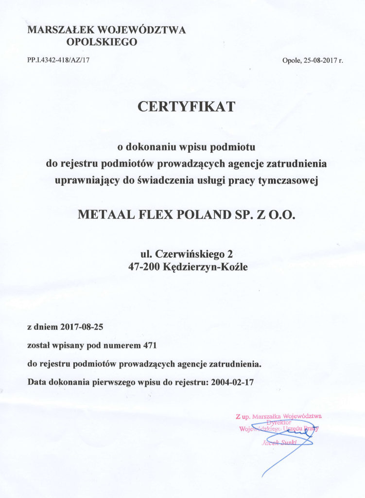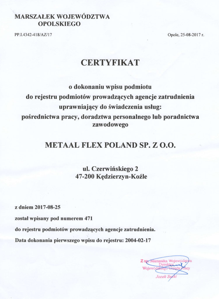 - Agencja Zatrudnienia Metaal Flex Poland Sp. z o. o. została wpisana do rejestru podmiotów prowadzących agencje zatrudnienia pod numerem 471